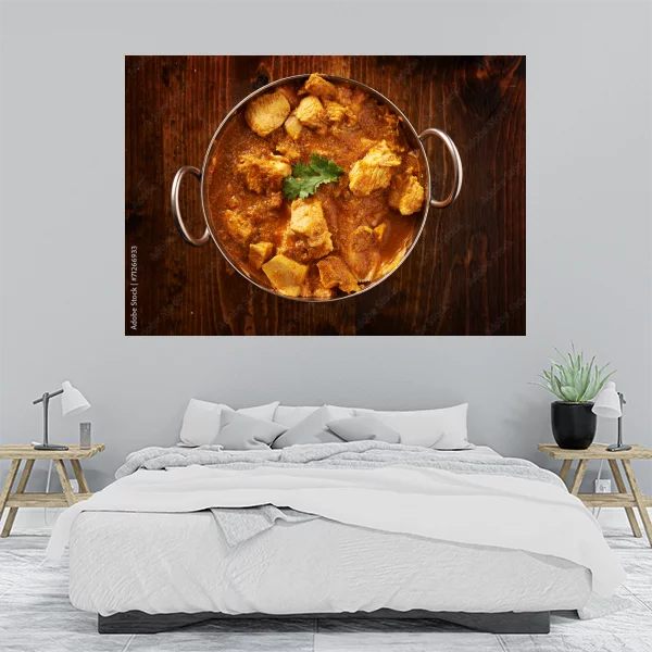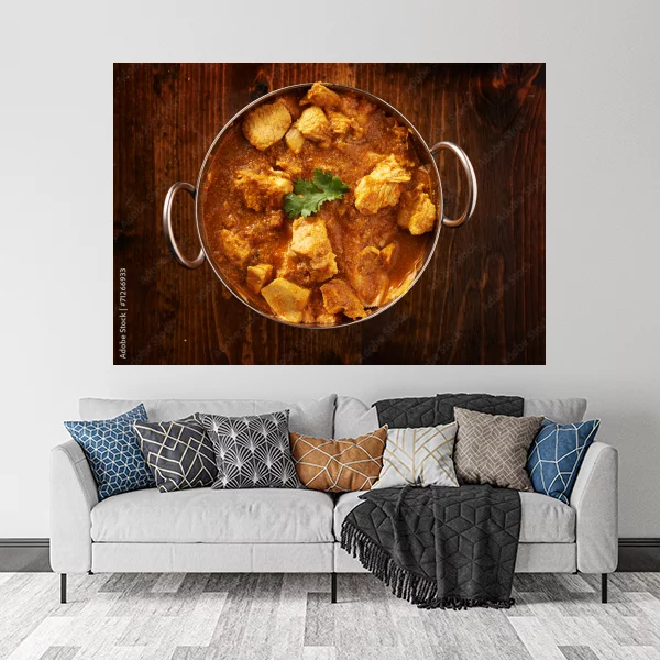 Przedstawiony obraz na ścianę ukazuje apetyczne danie, widziane z góry. Centralnym elementem jest metalowa misa z uchwytami po obu stronach, wypełniona aromatycznym, duszonym daniem, prawdopodobnie curry. W potrawie można dostrzec kawałki mięsa, zanurzone w gęstym, pomarańczowo-brązowym sosie. Na wierzchu znajduje się dekoracyjny liść kolendry. Tło zdjęcia to rustykalna drewniana powierzchnia, która podkreśla ciepłą i domową atmosferę całości.