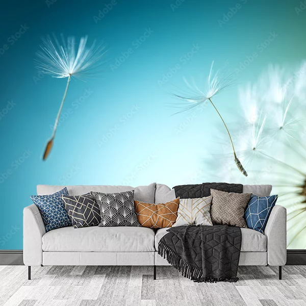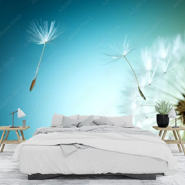 Na obrazie widzimy zbliżenie rozkwitającego dmuchawca w momencie, kiedy jego nasiona unoszą się w powietrzu. Tło obrazu jest niebieskie, tworząc łagodne, płynne przejście od intensywniejszego odcienia na górze do jaśniejszego na dole. Wyostrzony punkt centralny przedstawia delikatne puchate nasiona, które wyglądają na lekko uniesione przez wiatr. Całość kompozycji jest subtelna i minimalistyczna, co sprawia, że obraz jest harmonią natury i lekkości, idealny jako dekoracja ścienna, szczególnie w formie fototapety, która może dodać przestrzeni uczucia spokoju i świeżości.