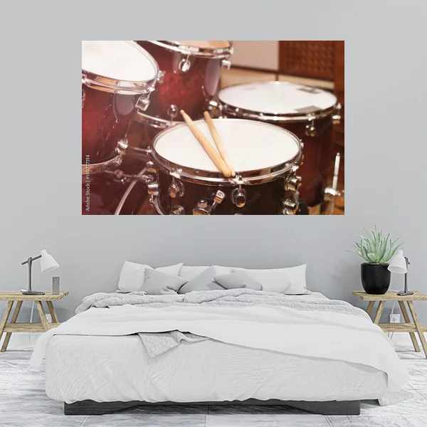 Prezentowany obraz na ścianę przedstawia zestaw perkusyjny złożony z bębnów o eleganckim, ciemnym wykończeniu oraz srebrnych okuciach. Na centralnym bębnie znajdują się dwie pałeczki perkusyjne, gotowe do użycia. Tło kompozycji jest delikatnie rozmyte i koncentruje uwagę na szczegółach perkusji, co nadaje obrazowi głębi i profesjonalnego wyglądu. Taki obraz może stanowić idealną dekorację dla miłośników muzyki, dodając ich przestrzeni osobistego charakteru i artystycznej atmosfery.
