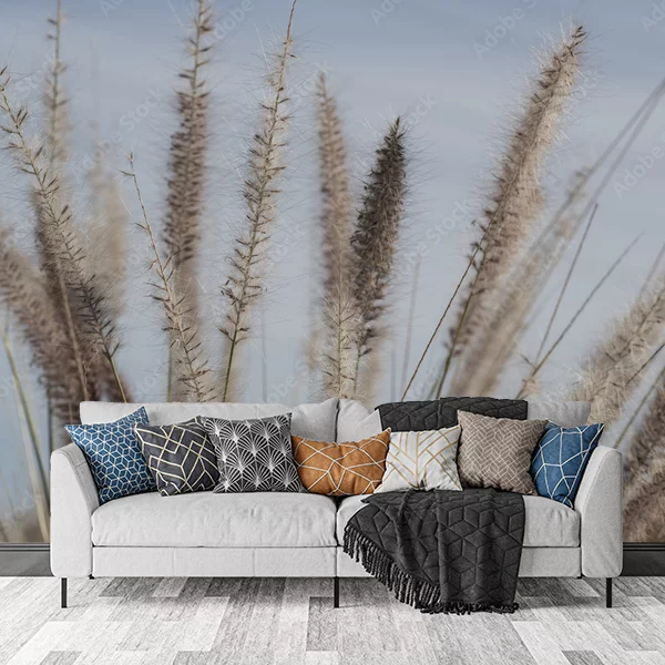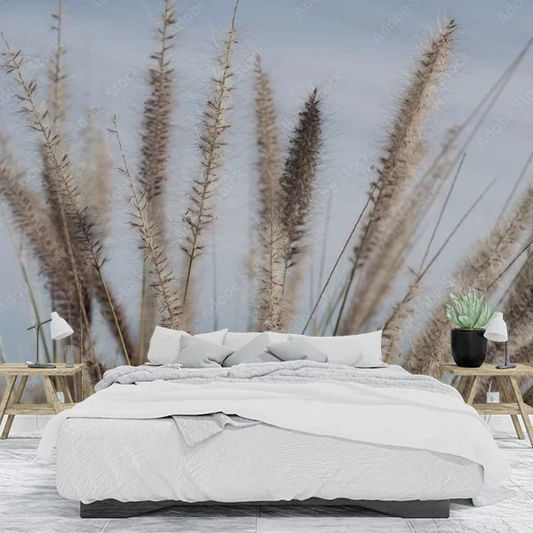 Fototapeta przedstawia wysokie trawy ozdobne o subtelnych, puszystych kłosach. Tła stanowi niebo w delikatnych, stonowanych barwach, co tworzy spokojną i harmonijną atmosferę. Taki obraz doskonale sprawdzi się w aranżacji wnętrz inspirowanych naturą, dodając im lekkości i elegancji.
