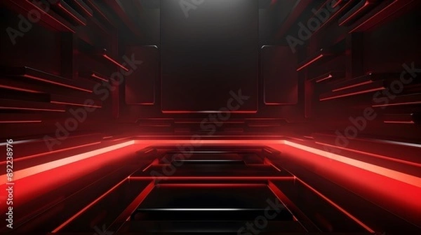 Fototapeta 3d rendering of red and black abstract geometric background. Scene for advertising, technology, showcase, banner, game, sport, cosmetic, business, metaverse. Sci-Fi Illustration. Product display zostanie wykonana z dbałością o każdy detal, dostępna jest na wysokiej jakości materiałach, takich jak lateks 130g/m2, flizelina 265g/m2, flizelina 350g/m2, winyl 350g/m2, beton 420g/m2, samoprzylepna i wiele innych zapewniających doskonałe nasycenie kolorów oraz trwałość. Każdy wzór jest tworzony z dbałością o najdrobniejsze detale, spełniając Twoje oczekiwania. Bryty drukowane są do szerokości 100cm (powyżej - bryty dzielone są na równe części).