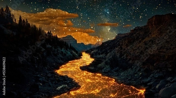Fototapeta A fiery river flowing through a mountain valley at night. zostanie wykonana z dbałością o każdy detal, dostępna jest na wysokiej jakości materiałach, takich jak lateks 130g/m2, flizelina 265g/m2, flizelina 350g/m2, winyl 350g/m2, beton 420g/m2, samoprzylepna i wiele innych zapewniających doskonałe nasycenie kolorów oraz trwałość. Każdy wzór jest tworzony z dbałością o najdrobniejsze detale, spełniając Twoje oczekiwania. Bryty drukowane są do szerokości 100cm (powyżej - bryty dzielone są na równe części).