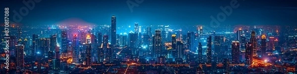 Fototapeta Aerial view Smart cityscape dot point connect with gradient line, connection technology metaverse concept. Bangkok, Thailand night city zostanie wykonana z dbałością o każdy detal, dostępna jest na wysokiej jakości materiałach, takich jak lateks 130g/m2, flizelina 265g/m2, winyl 290g/m2, beton 450g/m2, samoprzylepna, dodatkowo laminowana i wiele innych zapewniających doskonałe nasycenie kolorów oraz trwałość. Każdy wzór jest tworzony z dbałością o najdrobniejsze detale, spełniając Twoje oczekiwania. Bryty drukowane są do szerokości 100cm (powyżej - bryty dzielone są na równe części).