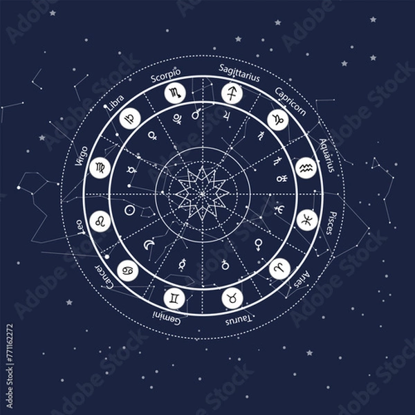 Fototapeta Astrology wheel with zodiac signs on constellation map background. Realistic illustration of zodiac signs. Dark blue background. Horoscope vector illustration zostanie wykonana z dbałością o każdy detal, dostępna jest na wysokiej jakości materiałach, takich jak lateks 130g/m2, flizelina 265g/m2, flizelina 350g/m2, winyl 350g/m2, beton 420g/m2, samoprzylepna i wiele innych zapewniających doskonałe nasycenie kolorów oraz trwałość. Każdy wzór jest tworzony z dbałością o najdrobniejsze detale, spełniając Twoje oczekiwania. Bryty drukowane są do szerokości 100cm (powyżej - bryty dzielone są na równe części).