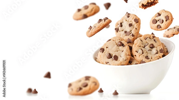 Fototapeta Chocolate chip cookies falling into a white bowl with chips scattered on a white background. zostanie wykonana z dbałością o każdy detal, dostępna jest na wysokiej jakości materiałach, takich jak lateks 130g/m2, flizelina 265g/m2, winyl 290g/m2, beton 450g/m2, samoprzylepna, dodatkowo laminowana i wiele innych zapewniających doskonałe nasycenie kolorów oraz trwałość. Każdy wzór jest tworzony z dbałością o najdrobniejsze detale, spełniając Twoje oczekiwania. Bryty drukowane są do szerokości 100cm (powyżej - bryty dzielone są na równe części).