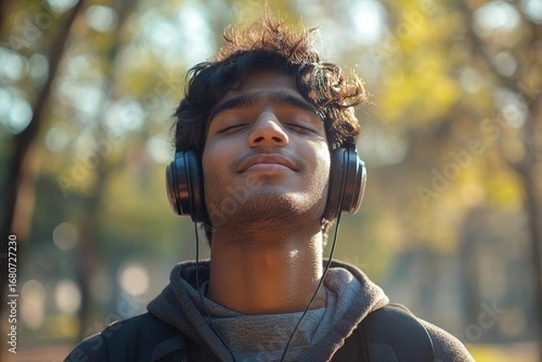 Fototapeta Close-up photo of a happy young sportsman standing on the street wearing headphones, looking contentedly at the phone screen, showcasing enjoyment of both exercise and digital, Generative AI zostanie wykonana z dbałością o każdy detal, dostępna jest na wysokiej jakości materiałach, takich jak lateks 130g/m2, flizelina 265g/m2, flizelina 350g/m2, winyl 350g/m2, beton 420g/m2, samoprzylepna i wiele innych zapewniających doskonałe nasycenie kolorów oraz trwałość. Każdy wzór jest tworzony z dbałością o najdrobniejsze detale, spełniając Twoje oczekiwania. Bryty drukowane są do szerokości 100cm (powyżej - bryty dzielone są na równe części).