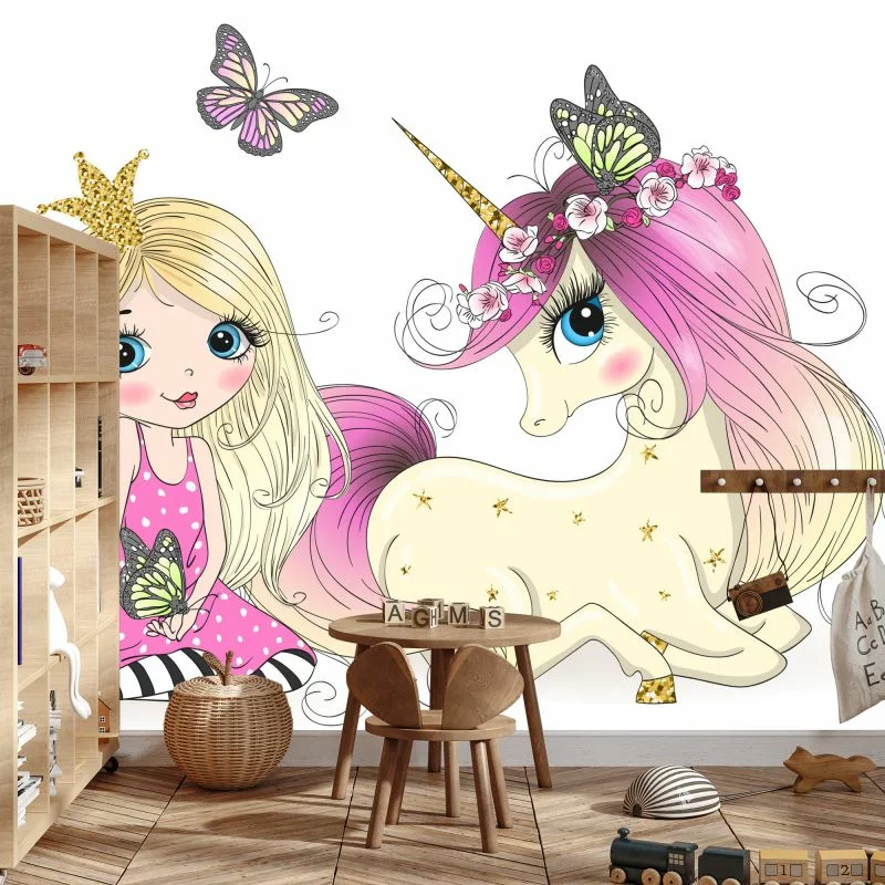 Fototapeta Dziewczynka I Jednorożec charakteryzuje się ciekawym motywem i jest uniwersalnym wyborem. Może sprawdzić się zarówno w pokoju, salonie czy też sypialni.