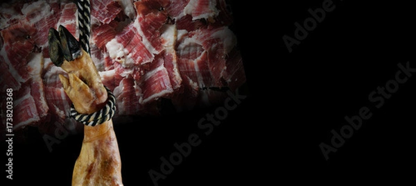 Fototapeta Jamón ibérico colgado con cuerda, fondo negro, lonchas visibles, textura roja, imagen gastronómica de producto.El jamón suspendido y cortado revela tradición, sabor y elegancia en una composición. zostanie wykonana z dbałością o każdy detal, dostępna jest na wysokiej jakości materiałach, takich jak lateks 130g/m2, flizelina 265g/m2, flizelina 350g/m2, winyl 350g/m2, beton 420g/m2, samoprzylepna i wiele innych zapewniających doskonałe nasycenie kolorów oraz trwałość. Każdy wzór jest tworzony z dbałością o najdrobniejsze detale, spełniając Twoje oczekiwania. Bryty drukowane są do szerokości 100cm (powyżej - bryty dzielone są na równe części).