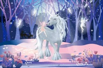 Fototapeta Jednorożec Z Wróżkami charakteryzuje się ciekawym motywem i jest uniwersalnym wyborem. Może sprawdzić się zarówno w pokoju, salonie czy też sypialni.