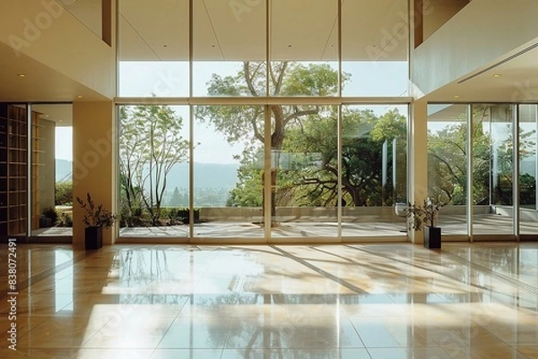 Fototapeta Large sunny room with expansive views through glass walls, minimalist and peaceful design zostanie wykonana z dbałością o każdy detal, dostępna jest na wysokiej jakości materiałach, takich jak lateks 130g/m2, flizelina 265g/m2, flizelina 350g/m2, winyl 350g/m2, beton 420g/m2, samoprzylepna i wiele innych zapewniających doskonałe nasycenie kolorów oraz trwałość. Każdy wzór jest tworzony z dbałością o najdrobniejsze detale, spełniając Twoje oczekiwania. Bryty drukowane są do szerokości 100cm (powyżej - bryty dzielone są na równe części).