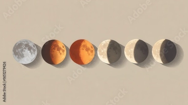 Fototapeta Lunar phases depicted in a sequential arrangement. zostanie wykonana z dbałością o każdy detal, dostępna jest na wysokiej jakości materiałach, takich jak lateks 130g/m2, flizelina 265g/m2, flizelina 350g/m2, winyl 350g/m2, beton 420g/m2, samoprzylepna i wiele innych zapewniających doskonałe nasycenie kolorów oraz trwałość. Każdy wzór jest tworzony z dbałością o najdrobniejsze detale, spełniając Twoje oczekiwania. Bryty drukowane są do szerokości 100cm (powyżej - bryty dzielone są na równe części).