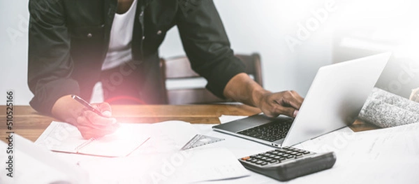 Fototapeta Male business owner working, packing the order for shipping to customer. Female entrepreneur packaging box for delivery. Ecommerce drop shipping shipment service concept.
