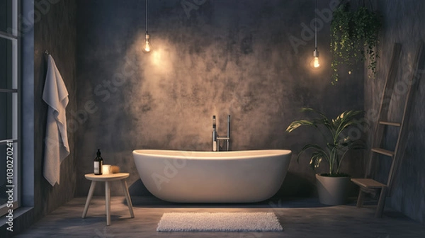 Fototapeta Minimalist bathroom with soft lighting, sleek white fixtures, a freestanding tub, and dark accents adding contrast zostanie wykonana z dbałością o każdy detal, dostępna jest na wysokiej jakości materiałach, takich jak lateks 130g/m2, flizelina 265g/m2, flizelina 350g/m2, winyl 350g/m2, beton 420g/m2, samoprzylepna i wiele innych zapewniających doskonałe nasycenie kolorów oraz trwałość. Każdy wzór jest tworzony z dbałością o najdrobniejsze detale, spełniając Twoje oczekiwania. Bryty drukowane są do szerokości 100cm (powyżej - bryty dzielone są na równe części).