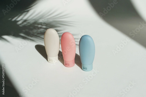 Fototapeta Mock up with travel size cosmetic bottles of pink, blue and white colors for shampoo, conditioner and body care lotion for vacation or journey with palm leaves shadows on background zostanie wykonana z dbałością o każdy detal, dostępna jest na wysokiej jakości materiałach, takich jak lateks 130g/m2, flizelina 265g/m2, winyl 290g/m2, beton 450g/m2, samoprzylepna, dodatkowo laminowana i wiele innych zapewniających doskonałe nasycenie kolorów oraz trwałość. Każdy wzór jest tworzony z dbałością o najdrobniejsze detale, spełniając Twoje oczekiwania. Bryty drukowane są do szerokości 100cm (powyżej - bryty dzielone są na równe części).