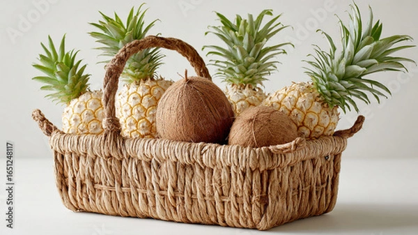 Fototapeta Natural woven basket filled with fresh pineapples and coconuts, showcasing tropical fruits with green spiky leaves and brown textured shells, on white surface with plain background zostanie wykonana z dbałością o każdy detal, dostępna jest na wysokiej jakości materiałach, takich jak lateks 130g/m2, flizelina 265g/m2, flizelina 350g/m2, winyl 350g/m2, beton 420g/m2, samoprzylepna i wiele innych zapewniających doskonałe nasycenie kolorów oraz trwałość. Każdy wzór jest tworzony z dbałością o najdrobniejsze detale, spełniając Twoje oczekiwania. Bryty drukowane są do szerokości 100cm (powyżej - bryty dzielone są na równe części).