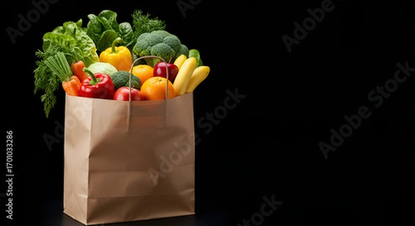 Fototapeta Paper bag filled with fresh vegetables and fruits such as broccoli, lettuce, oranges, apple, cucumber, and strawberries on black background.