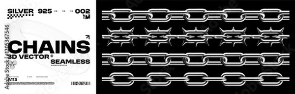 Fototapeta Realistic metallic 3D silver chains seamless. Vector set zostanie wykonana z dbałością o każdy detal, dostępna jest na wysokiej jakości materiałach, takich jak lateks 130g/m2, flizelina 265g/m2, winyl 290g/m2, beton 450g/m2, samoprzylepna, dodatkowo laminowana i wiele innych zapewniających doskonałe nasycenie kolorów oraz trwałość. Każdy wzór jest tworzony z dbałością o najdrobniejsze detale, spełniając Twoje oczekiwania. Bryty drukowane są do szerokości 100cm (powyżej - bryty dzielone są na równe części).