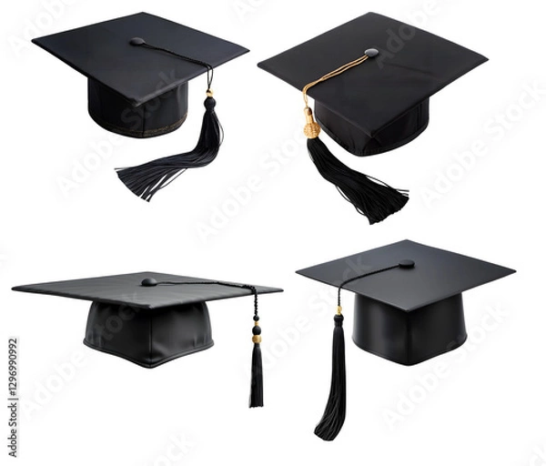 Fototapeta Set of top graduation cap designs isolated on a transparent background. Uses for education, university, college, and campus. PNG zostanie wykonana z dbałością o każdy detal, dostępna jest na wysokiej jakości materiałach, takich jak lateks 130g/m2, flizelina 265g/m2, winyl 290g/m2, beton 450g/m2, samoprzylepna, dodatkowo laminowana i wiele innych zapewniających doskonałe nasycenie kolorów oraz trwałość. Każdy wzór jest tworzony z dbałością o najdrobniejsze detale, spełniając Twoje oczekiwania. Bryty drukowane są do szerokości 100cm (powyżej - bryty dzielone są na równe części).