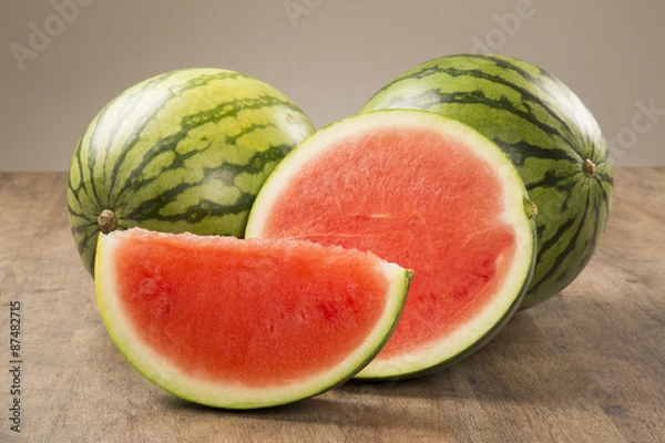 Fototapeta slices of watermelon on wooden table zostanie wykonana z dbałością o każdy detal, dostępna jest na wysokiej jakości materiałach, takich jak lateks 130g/m2, flizelina 265g/m2, flizelina 350g/m2, winyl 350g/m2, beton 420g/m2, samoprzylepna i wiele innych zapewniających doskonałe nasycenie kolorów oraz trwałość. Każdy wzór jest tworzony z dbałością o najdrobniejsze detale, spełniając Twoje oczekiwania. Bryty drukowane są do szerokości 100cm (powyżej - bryty dzielone są na równe części).