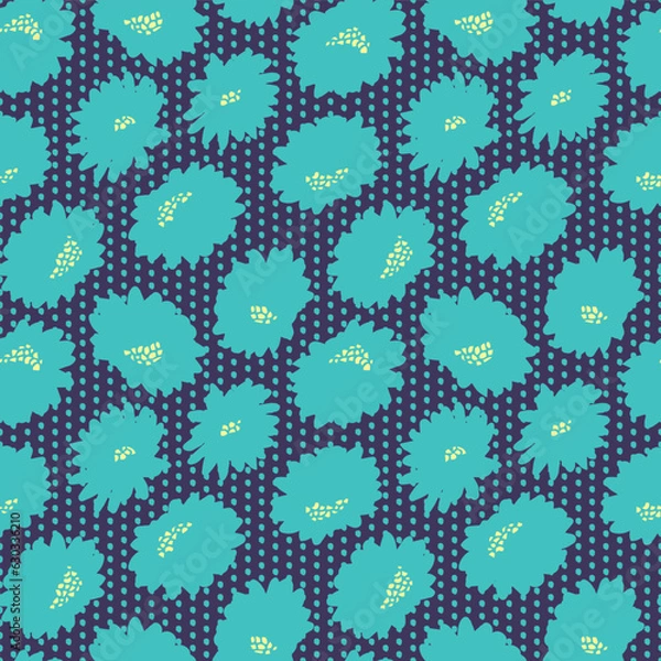 Fototapeta Vector stamp teal flowers dots dark repeat pattern zostanie wykonana z dbałością o każdy detal, dostępna jest na wysokiej jakości materiałach, takich jak lateks 130g/m2, flizelina 265g/m2, winyl 290g/m2, beton 450g/m2, samoprzylepna, dodatkowo laminowana i wiele innych zapewniających doskonałe nasycenie kolorów oraz trwałość. Każdy wzór jest tworzony z dbałością o najdrobniejsze detale, spełniając Twoje oczekiwania. Bryty drukowane są do szerokości 100cm (powyżej - bryty dzielone są na równe części).