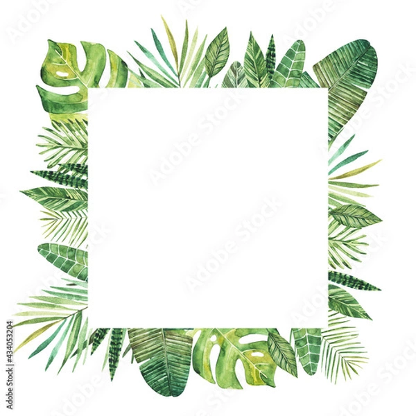 Fototapeta Watercolor square frame of tropical leaves and branches. A background for invitations, advertising, postcards zostanie wykonana z dbałością o każdy detal, dostępna jest na wysokiej jakości materiałach, takich jak lateks 130g/m2, flizelina 265g/m2, winyl 290g/m2, beton 450g/m2, samoprzylepna, dodatkowo laminowana i wiele innych zapewniających doskonałe nasycenie kolorów oraz trwałość. Każdy wzór jest tworzony z dbałością o najdrobniejsze detale, spełniając Twoje oczekiwania. Bryty drukowane są do szerokości 100cm (powyżej - bryty dzielone są na równe części).