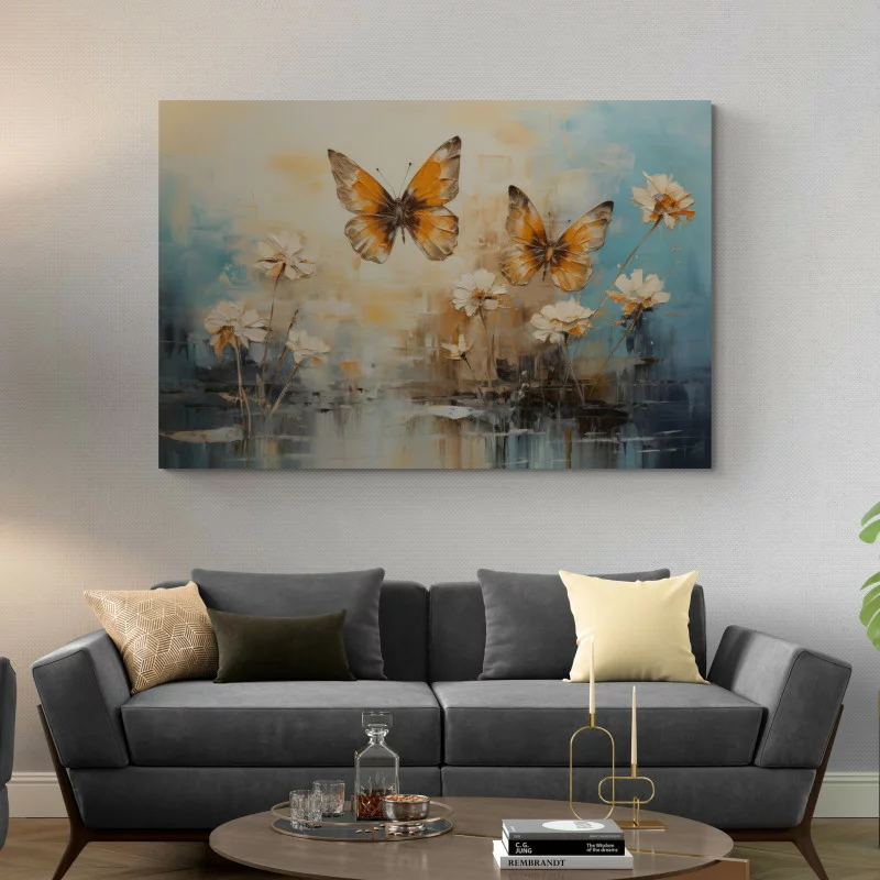 Obraz abstrakcja - motyli raj w doskonały sposób urozmaici każde wnętrze, stanowiąc praktyczny i niezwykle efektowny dodatek aranżacyjny. Proponowany obraz drukowany jest na wysokiej jakości płótnie, które umożliwia doskonałe odwzorowanie kolorów, zachowując oryginalne wzory i głęboką paletę barw. Połączenie nowoczesnej metody zadruku z wysokiej klasy płótnem umożliwia stworzenie obrazu odznaczającego się możliwie najwyższą rozdzielczością i ostrością obrazu.