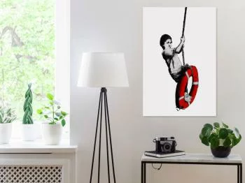 Obraz - Banksy: Chłopiec na linie (1-częściowy) pionowy w doskonały sposób urozmaici każde wnętrze, stanowiąc praktyczny i niezwykle efektowny dodatek aranżacyjny. Proponowany obraz jest wysokiej jakości, który doskonale odwzorowuje kolory oraz posiada głęboką paletę barw.