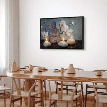 obraz na płótnie "Obraz - Budda i kamienie (1-częściowy) szeroki" może z powodzeniem zająć centralne miejsce w pomieszczeniu. Będzie przykuwał uwagę, a jednocześnie idealnie współgrał z pozostałymi elementami wyposażenia. Takie dekoracje ścienne stworzą piękny duet z niewielkim stolikiem kawowym, delikatną toaletką, Twoim ulubionym fotelem czy innym ważnym meblem w pokoju. Wykorzystasz je tak, jak zechcesz, tworząc niepowtarzalną aranżację. Oferujemy
