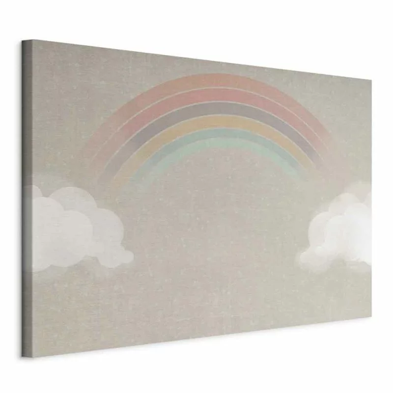 obraz na płótnie "Obraz - Deszczowy czerwiec - kolorowa tęcza wychodząca z chmur na jasnym tle / Kolorowa tęcza" może z powodzeniem zająć centralne miejsce w pomieszczeniu. Będzie przykuwał uwagę, a jednocześnie idealnie współgrał z pozostałymi elementami wyposażenia. Takie dekoracje ścienne stworzą piękny duet z niewielkim stolikiem kawowym, delikatną toaletką, Twoim ulubionym fotelem czy innym ważnym meblem w pokoju. Wykorzystasz je tak, jak zechcesz, tworząc niepowtarzalną aranżację. Oferujemy