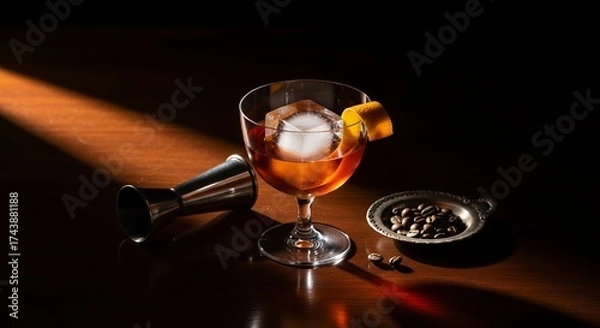 Obraz Elegant cocktail with large ice cube, orange twist, and coffee beans on a wooden surface, light painting style. Concept for beverage photography, artisanal drink promotion and bar menu design zostanie wykonany na wybranym materiale oraz o podanych wymiarach gotowy już do powieszenia na ścianie. Stwórz swój indywidualny i wyjątkowy obraz korzystając z naszego zaawansowanego generatora. Odśwież wnętrze swojego domu dzięki personalizowanym grafikom, dostępnym na różnych materiałach, takich jak płótno poliestrowe, bawełniane, płyta PCV 5mm, szkło optywhite 4mm. Nasz generator pozwala nie tylko dostosować rozmiar i materiał obrazu, ale również modyfikować kolorystykę, nasycenie barw oraz odkrywać podobne obrazy, które pasują do Twojego stylu dzięki funkcji zobacz podobne. Jeżeli chcesz zamówić obraz z własnej grafiki wczytaj zdjęcie.