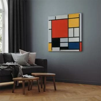 obraz na płótnie "Obraz - Piet Mondrian – Kompozycja z czerwonym, żółtym, niebieskim i czarnym" może z powodzeniem zająć centralne miejsce w pomieszczeniu. Będzie przykuwał uwagę, a jednocześnie idealnie współgrał z pozostałymi elementami wyposażenia. Takie dekoracje ścienne stworzą piękny duet z niewielkim stolikiem kawowym, delikatną toaletką, Twoim ulubionym fotelem czy innym ważnym meblem w pokoju. Wykorzystasz je tak, jak zechcesz, tworząc niepowtarzalną aranżację. Oferujemy
