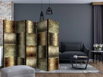 Parawan 5-częściowy - Metalowe płytki to doskonały sposób na ubogacenie wnętrza nietuzinkową ozdobą. Wysokiej jakości wzór oraz najwyższa klasa materiałów sprawią, że parawan idealnie podkreśli wystrój wnętrza, jednocześnie dyskretnie dzieląc pomieszczenie, a także zasłaniając mniej reprezentatywne jego części.