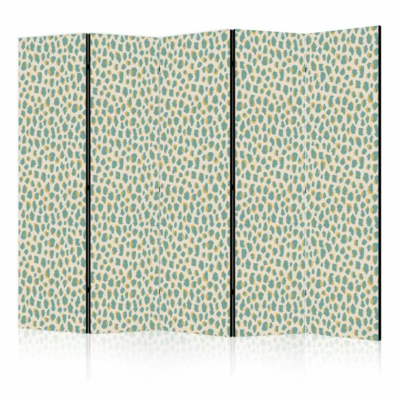 Parawan "Parawan - Deseń żyrafy - zwierzęcy wzór w turkusowe plamki na jasnym tle" to element wyposażenia dający wiele możliwości. Cechuje go m.in. praktyczność. Jego podstawowym zadaniem jest podzielenie przestrzeni na kilka stref w dyskretny i estetyczny sposób.