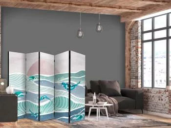 Parawan - Malowniczy krajobraz z rybami - Zachód słońca i rybki Koi w odcieniach turkusu i błękitu unoszące się ponad wodą to doskonały sposób na ubogacenie wnętrza nietuzinkową ozdobą.  Wysokiej jakości wzór oraz najwyższa klasa materiałów sprawią, że parawan idealnie podkreśli wystrój wnętrza, jednocześnie dyskretnie dzieląc pomieszczenie, a także zasłaniając mniej reprezentatywne jego części.