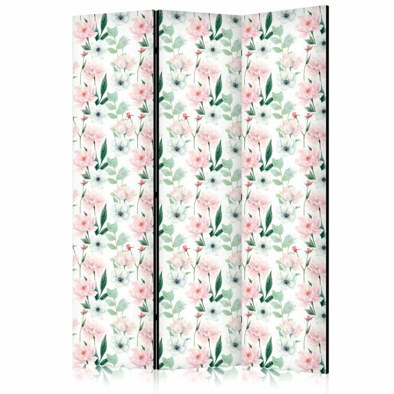 Parawan - Piwonie - różowe i białe kwiaty i zielone listki na białym tle to doskonały sposób na ubogacenie wnętrza nietuzinkową ozdobą.  Wysokiej jakości wzór oraz najwyższa klasa materiałów sprawią, że parawan idealnie podkreśli wystrój wnętrza, jednocześnie dyskretnie dzieląc pomieszczenie, a także zasłaniając mniej reprezentatywne jego części.