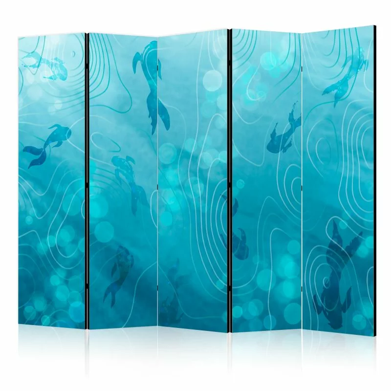 Parawan dekoracyjny "Parawan - Rybki Koi pod taflą wody - Gromada japońskich ryb w głębinach stawu w odcieniach granatu i błękitu" przypadnie do gustu nawet bardzo wymagającym osobom.