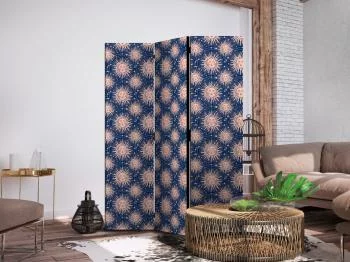 Parawan dekoracyjny "Parawan - Słoneczne Wzory - powtarzający się motyw słońca na granatowym tle" przypadnie do gustu nawet bardzo wymagającym osobom.