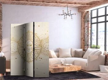 Parawan dekoracyjny "Parawan - Złote Słońce i Księżyc - artystyczna ilustracja w stylu retro" przypadnie do gustu nawet bardzo wymagającym osobom.