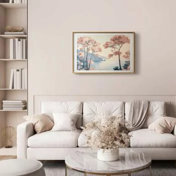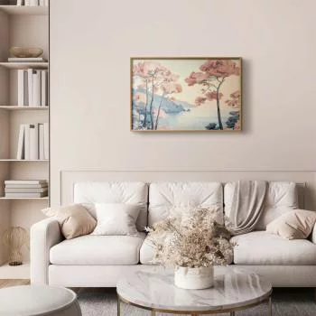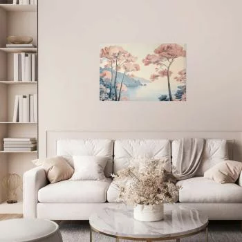 Plakat - Ocean klify i drzewa; delikatny motyw w pastelowych kolorach charakteryzuje się ciekawym motywem i jest uniwersalnym wyborem. Może sprawdzić się zarówno w pokoju, salonie czy też sypialni.