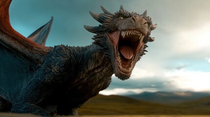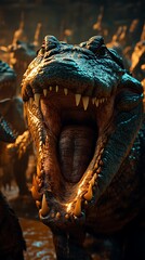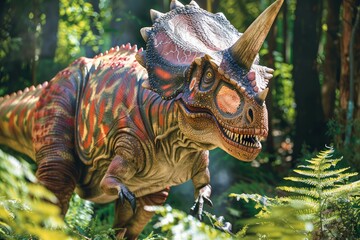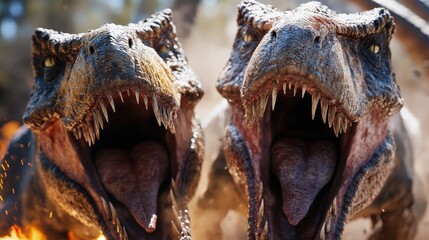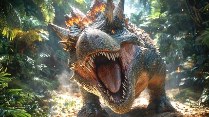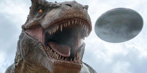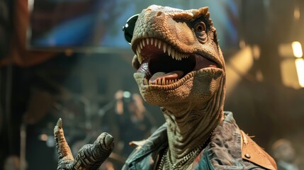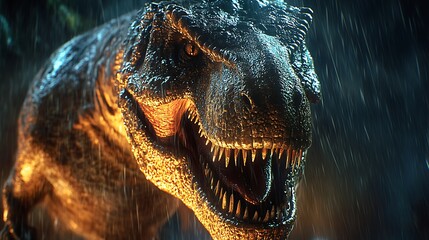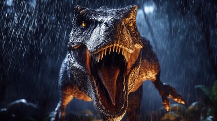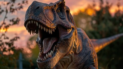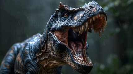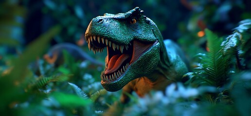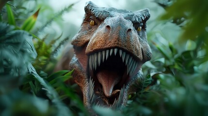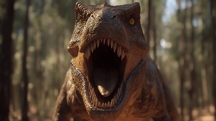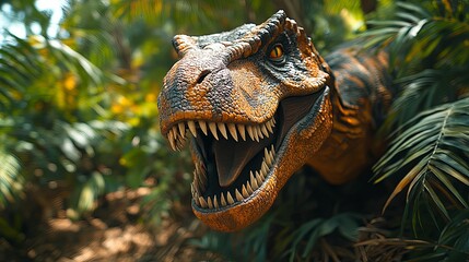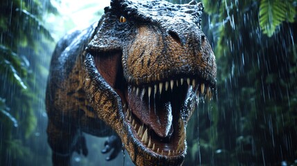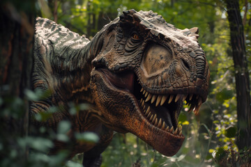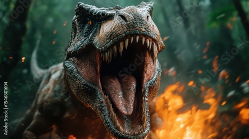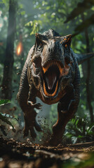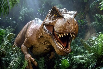 Podobny obraz A menacing T-Rex roaring in a lush, prehistoric forest...